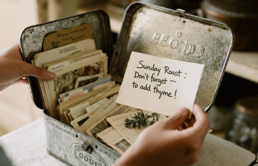 The top card read: “Sunday Roast – Don’t forget the thyme!” in her loopy handwriting.
